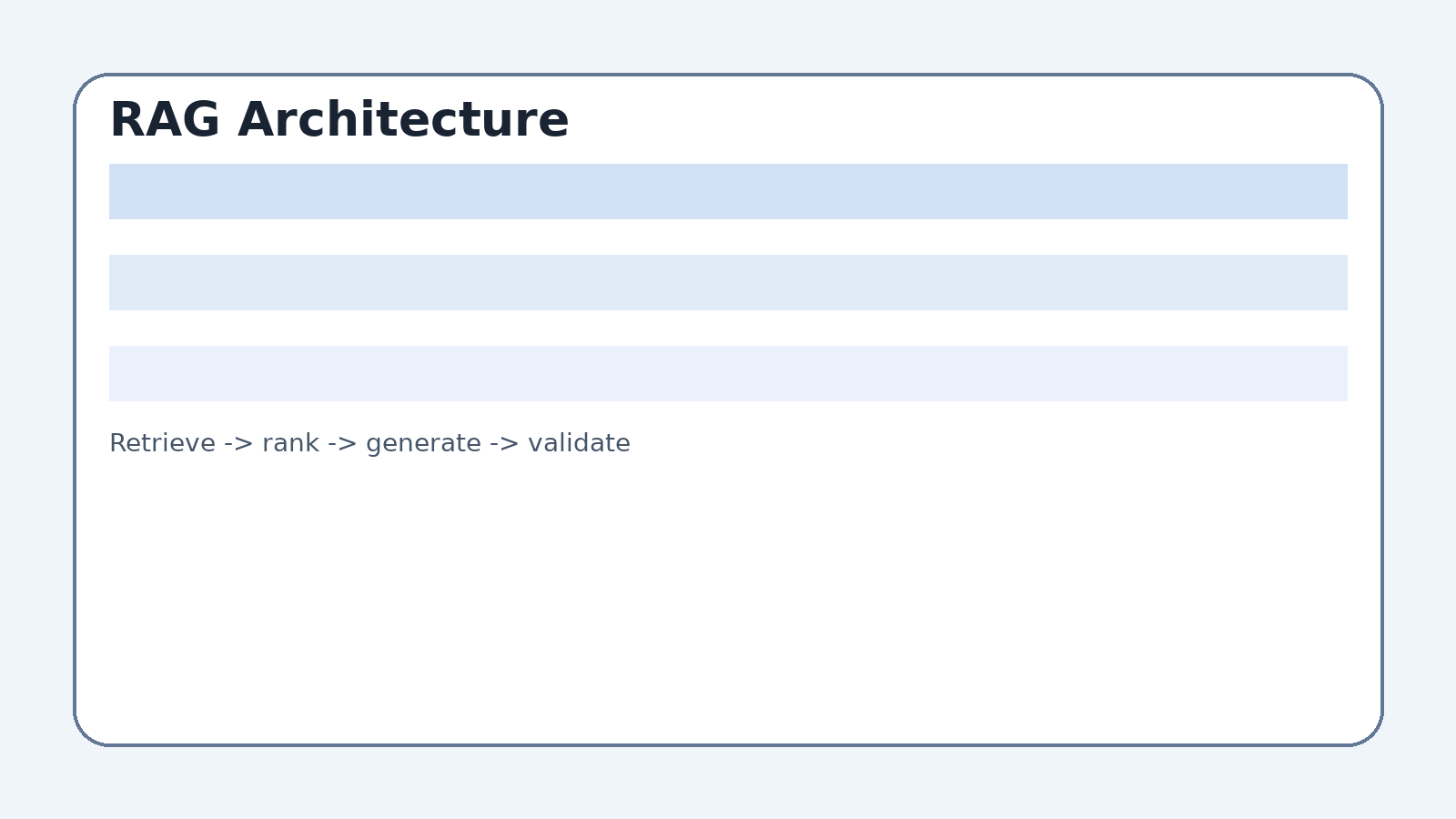Retrieval-Augmented Generation, or RAG, connects a model to trusted information sources at runtime. Instead of relying only on training data, the system retrieves relevant documents, passes that context into the prompt, and produces an answer grounded in current or private information.